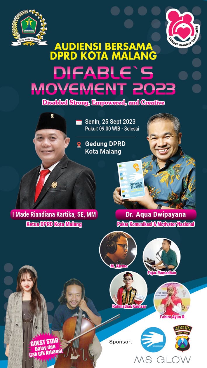 MALANG, Tugujatim.id – Komunitas Difabel Creative Community (DC2) menggelar acara Audiensi bareng DPRD Kota Malang dan Motivator Nasional Dr Aqua Dwipayana bertajuk ”Difable’s Movement 2023: Disabled Strong, Empowered, and Creative” di hall gedung DPRD Kota Malang, Senin (25/09/2023). Acara ini pun menyedot antusias 300-an difabel di Malang. Ketua DC2 Sutarno mengatakan, pihaknya menggelar acara ini […]